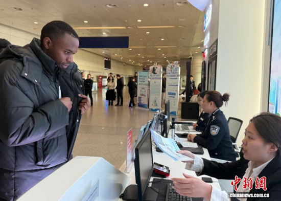 1月20日,吉林長(zhǎng)春,外國(guó)留學(xué)生在長(zhǎng)春龍嘉國(guó)際機(jī)場(chǎng)“吉便利”出入境一站式綜合服務(wù)窗口辦理相關(guān)業(yè)務(wù)。 中新社記者 張瑤 攝