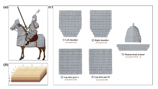 本研究對象是目前世界上已知最早的可復(fù)原甲騎具裝實(shí)物—出土于遼寧北票喇嘛洞墓地的珍貴遺存。研究結(jié)果表明,這套甲胄從結(jié)構(gòu)設(shè)計(jì)到材質(zhì)加工均體現(xiàn)出高度的技術(shù)成熟度,證明鮮卑在公元4至5世紀(jì)已具備先進(jìn)的甲胄制造能力;而古蛋白質(zhì)組學(xué)分析首次證實(shí),甲胄制作中使用了羊源材料——這一發(fā)現(xiàn)填補(bǔ)了古代游牧民族甲胄材質(zhì)研究的空白,為探討當(dāng)時草原地區(qū)的動物資源利用、畜牧業(yè)發(fā)展與軍事手工業(yè)的關(guān)聯(lián)提供了直接證據(jù)。
