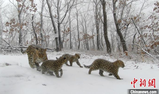 2024年12月2日,在東北虎豹國家公園東寧轄區(qū),四只東北豹冒雪活動。(資料圖)(東北虎豹國家公園管理局供圖)