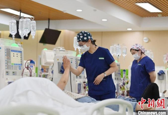 5月9日,長春中醫(yī)藥大學附屬醫(yī)院腎病科門診透析室內,護士在為患者加油打氣!埇 攝