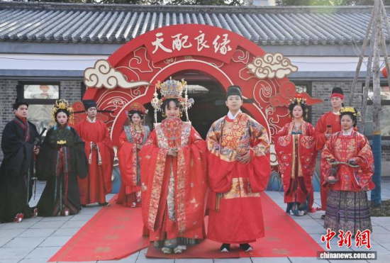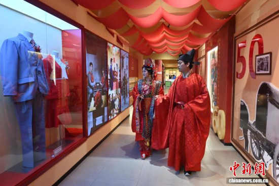 11月7日,偽滿皇宮博物院主辦的《天配良緣——近現(xiàn)代婚戀婚俗實物展》于長春開幕。展覽通過婚書、嫁妝等300余件民間實物,帶領(lǐng)參觀者沉浸式感受不同年代的婚禮婚俗,F(xiàn)場通過漢服走秀、嗩吶演奏等演出,展現(xiàn)傳統(tǒng)婚儀魅力。中新社記者 張瑤 攝