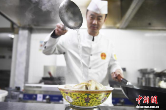 2月5日,吉林石光酒樓的后廚里,廚師烹飪“滿族八大碗”菜品小雞榛蘑粉。中新社記者 石洪宇 攝