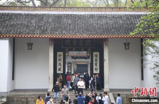 岳麓書院大門有一副集句聯(lián),上聯(lián)是“惟楚有材”,源自《左傳》;下聯(lián)是“于斯為盛”,出自《論語(yǔ)》。圖為3月30日,岳麓書院人來(lái)人往。(資料圖片) 中新社記者 楊華峰 攝