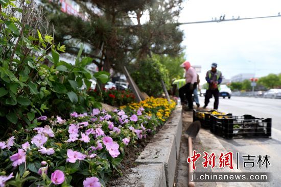 5月25日,記者在河南街與長白山西路交匯路段看到,園林工人正在緊張有序地栽種花苗,鮮花成片鋪展,紅黃相間,美不勝收。正在散步的市民王女士一邊駐足觀賞一邊拍照留念,她說:“這些花開得真美,走在街上都覺得心情特別好。”