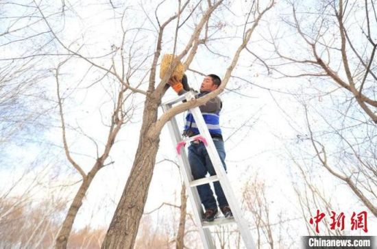 11月23日,趁著雪后天晴,吉林長(zhǎng)春友誼公園的工作人員忙著維護(hù)樹上的草編鳥巢,并投放了鳥糧。該公園生態(tài)環(huán)境好、野生鳥類多,園方已經(jīng)連續(xù)三年在園區(qū)設(shè)置百余個(gè)草編鳥巢助鳥類安全過(guò)冬。