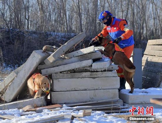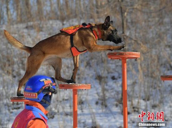 1月18日,在吉林省森林消防總隊(duì)特勤大隊(duì)訓(xùn)練場(chǎng)內(nèi),搜救犬正在訓(xùn)練。為提高搜救犬在嚴(yán)寒環(huán)境的適應(yīng)和實(shí)戰(zhàn)能力,吉林省森林消防總隊(duì)特勤大隊(duì)搜救犬分隊(duì)近期通過(guò)障礙攀登、繞腿訓(xùn)練、廢墟搜索訓(xùn)練等科目,對(duì)搜救犬進(jìn)行冬訓(xùn),進(jìn)一步提升訓(xùn)導(dǎo)員與搜救犬的默契度和技戰(zhàn)素養(yǎng)。