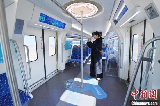 3月21日,全球首列氫能源市域列車在長春進行時速160公里滿載運行試驗。圖為列車車廂內(nèi)部。中新社記者 張瑤 攝