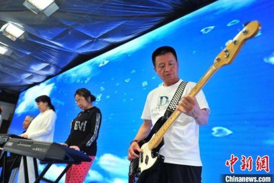 7月4日,吉林長春,火焰老年樂隊(duì)在演奏搖滾樂。這支樂隊(duì)有7名樂手和7名主唱,平均年齡62歲,是吉林省為數(shù)不多的老年搖滾樂隊(duì)。他們?cè)诩ぐ旱臉仿曋袑?shí)現(xiàn)自己的搖滾夢(mèng),尋回年輕的感覺。