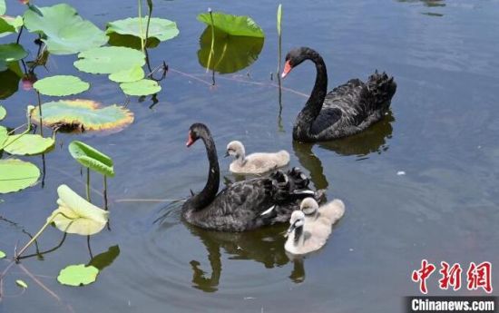 吉林長春:黑天鵝“添丁” 一家五口暢游荷花池