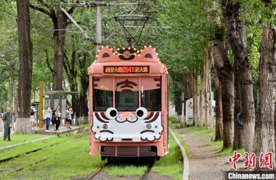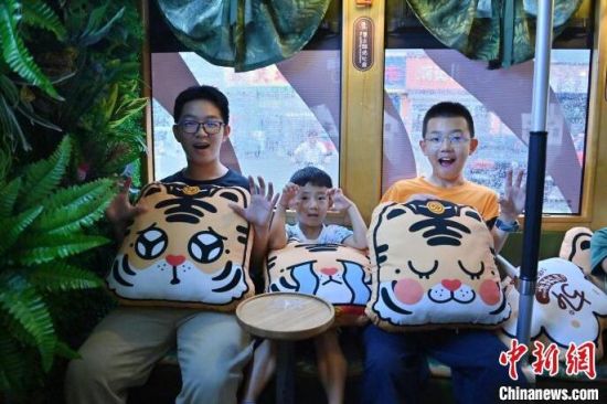 8月5日,吉林長春,游客在54路文旅東北虎專列內(nèi)拍照。該專列是以“東北虎”為主題的有軌電車文旅專列,步入其中、綠意盈盈“森系”十足,吸引眾多游客前來打卡。(中新社記者 張瑤/攝)