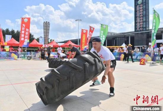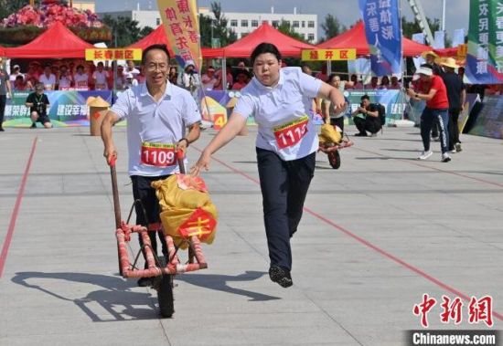 8月16日,吉林長(zhǎng)春,農(nóng)民趣味運(yùn)動(dòng)會(huì)在長(zhǎng)春農(nóng)博園精彩上演,運(yùn)動(dòng)會(huì)設(shè)置了“喜獲豐收”“回娘家”“農(nóng)田大力士”等充滿(mǎn)鄉(xiāng)村特色的比賽項(xiàng)目。圖為選手在“喜獲豐收”比賽中。中新社記者 張瑤 攝