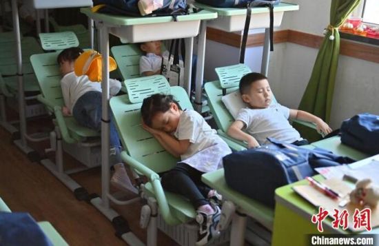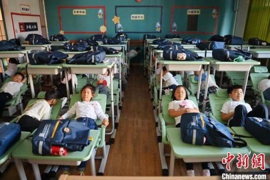 9月5日,在長春南湖實驗中海小學(xué),學(xué)生們在“可躺式”課桌椅上午睡。目前,吉林省有多所學(xué)校已啟用“可躺式”課桌椅,學(xué)生們中午可以躺著休息。中新社記者 張瑤 攝