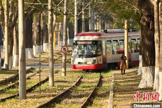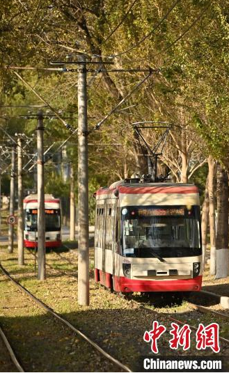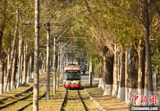 10月9日,吉林長春,一輛有軌電車在泛黃的樹木中行駛,呈現(xiàn)出別有韻味的秋季景致,吸引游客打卡。中新社記者 張瑤 攝