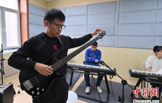 11月14日,吉林長(zhǎng)春,“逐暗逐光”樂隊(duì)成員在交流排練細(xì)節(jié)。長(zhǎng)春大學(xué)特教學(xué)院有一支名叫“逐暗逐光”的樂隊(duì),樂隊(duì)成員都是視障學(xué)生。他們因音樂相聚在一起,用音樂去驅(qū)逐黑暗追逐光明。中新社記者 張瑤 攝