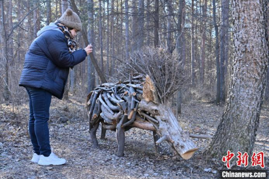 11月18日,在位于吉林長春的凈月潭國家級(jí)風(fēng)景名勝區(qū)內(nèi),游客在參觀雕塑。凈月潭國家級(jí)風(fēng)景名勝區(qū)的工作人員利用一個(gè)月的時(shí)間,用掉落的枯枝制作成多處雕塑,成為冬日一景。中新社記者 張瑤 攝