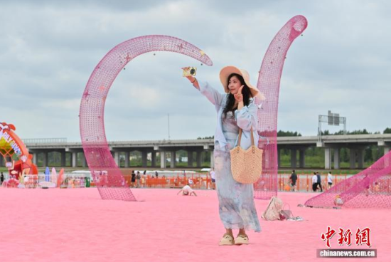 7月24日,長春市一處人工打造的粉沙灘吸引眾多游客前來打卡。這片沙灘呈現(xiàn)出夢(mèng)幻的粉色,搭配周邊綠植和休閑設(shè)施,營造出浪漫氛圍。中新社記者 張瑤 攝