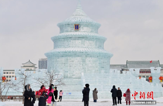 1月12日,在長春市的文化廣場上,一座以北京天壇祈年殿為原型的巨型冰雕成為冬日一景。冰雕高約21米,用冰量5010立方米,飛檐、殿頂?shù)葌鹘y(tǒng)建筑細(xì)節(jié)均被精準(zhǔn)復(fù)刻,陽光下晶瑩剔透,配合紅燈籠冰柱點(diǎn)綴,盡顯中式浪漫韻味,吸引眾多游客前來拍照打卡。中新社記者 張瑤 攝