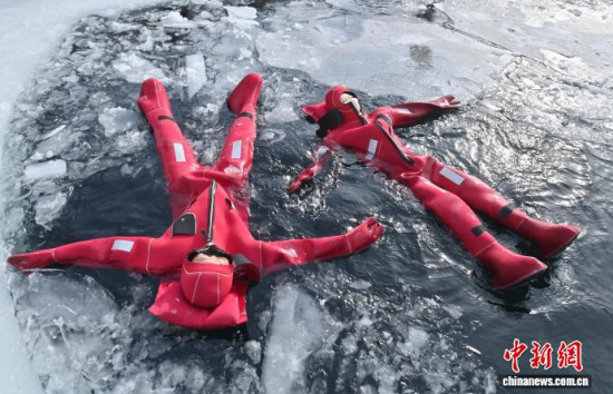 2月5日,吉林省長春市,一項獨特的冰浮項目吸引眾多游客前來體驗。在嚴(yán)寒天氣中,參與者身穿醒目的紅色浮力裝備,悠然漂浮于冰面之上,感受別致的冰雪樂趣。圖為游客在下水前拍照留念。中新社記者 張瑤 攝
